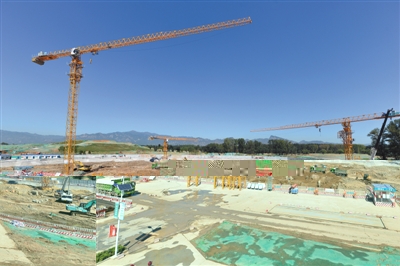 北望海坨山,南觀八達嶺長城,占地面積500多公頃的世園會園區,如今是一片巨大工地。
